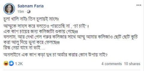 শনিবার দুপুরে নিজের ফেসবুকে একটি স্ট্যাটাস পোস্ট করেন ফারিয়া। তার সেই স্ট্যাটাস মুহূর্তেই ভাইরাল হয়ে যায়। এক ঘণ্টার মধ্যেই সেই পোস্টে প্রায় ২ হাজার লাইক এবং ১৭টি শেয়ার হয়। বাংলাদেশ জার্নালের পাঠকদের জন্য তার সেই স্ট্যাটাসটি হুবুহু তুলে ধরা হলো-