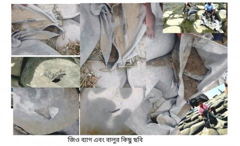 নদীর পাড়ে হেঁটে সরেজমিনে দেখলাম, বাগদা চিংড়ি ধরা স্থান এবং না ধরা স্থানের জিও ব্যাগ ডাম্পিং বস্তা গুলো ফেটে বালু শূন্য দেখাচ্ছে। তাহলে প্রশ্ন..! বাগদা চিংড়ি ধরা জালে কি বস্তা ফেটে যাচ্ছে..? না জিও ব্যাগের বস্তা ও বালু নিম্নমান..? কতটুকু নিশ্চিত.. বাগদা ধরা জালে ডাম্পিং বস্তা ক্ষতির মুখে পড়ছে..! বস্তার মধ্যখানে বালু সরে খালি হচ্ছে। তখন খালি বস্তাটুকু বৃষ্টিতে ভিজে রৌদ্রে শুকাচ্ছে। কিছুদিন পর বস্তার মাঝখান ফেটে বালু সরে যাচ্ছে।